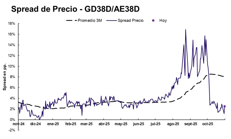 - Los spreads de legislación en la curva hard dollar marcaron máximos recientes en la semana del 20 de octubre, expandiéndose fuertemente post-PBA hacia niveles no vistos desde las cotizaciones pre-Milei.