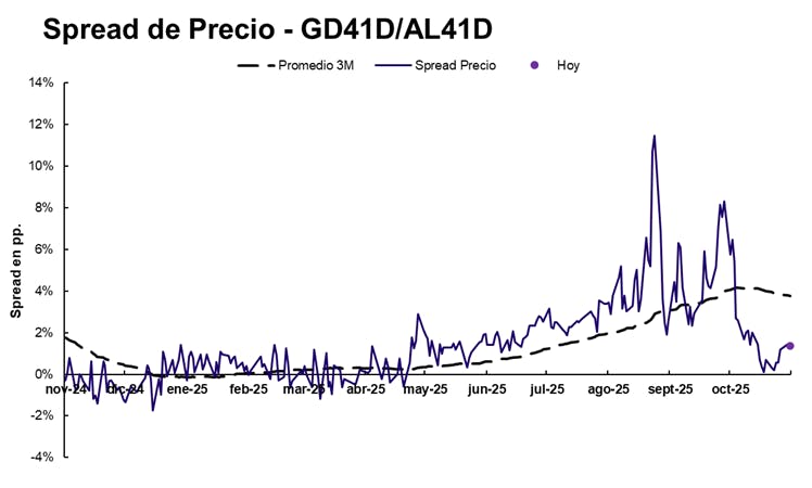 - Hasta el comienzo del ruido allá por principios de agosto, estos spreads cotizaban en un promedio del 1,1% para los 35s, 3,4% para los 38s y cercano al 0% para los 41s. En primer lugar, el diferencial entre el AL35 y GD35 comprimió hasta la zona del 1%, ubicándose por debajo de la mediana de los últimos 12 meses. Por su parte, el spread entre el AE38 y el GD38 se encuentra en 2,5%, nivel no visto desde junio de este año, a la vez que debemos remitirnos hacia enero para verlo por debajo del 2%. Finalmente, el diferencial entre el AL41 y el GD41 se agotó hasta el actual 1,3%, por lo que se volvió a inclinar a favor de la ley extranjera.