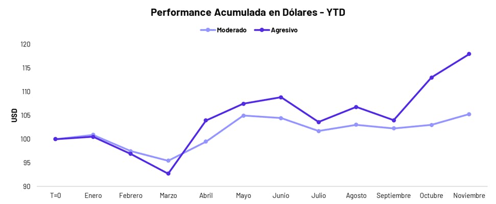 - En el acumulado de este 2025 (YTD), el portafolio con Inversiones más estables obtuvo un rendimiento de +5,4%, y el agresivo de +18,0% medidos en dólares.