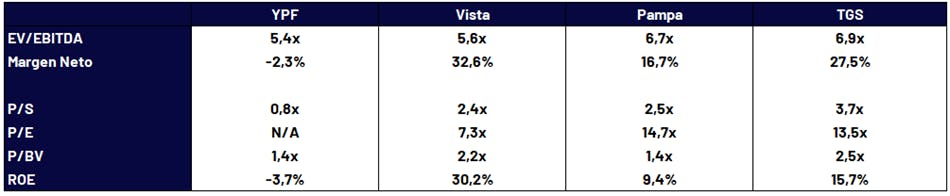 - Dicho esto, en términos de potencial de upside, vemos mayores oportunidades relativas en YPF y Vista Energy, dadas sus valuaciones más comprimidas y una sensibilidad más directa al ciclo de expansión de producción en shale.