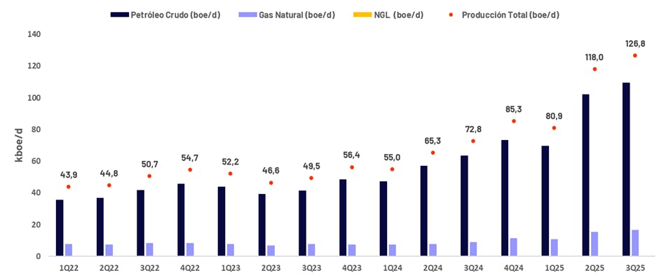 - Vista Energy alcanzó una producción total promedio de 126,8 kboe/d, lo que representa un crecimiento de 74% interanual y 7% frente al trimestre anterior. En detalle, la producción de petróleo fue de 109,7 kbbl/d (+73% y/y; +7% q/q), mientras que el gas natural alcanzó 2,65 MMm3/d (+87% y/y; +9% q/q). Durante el trimestre, la totalidad del crudo se vendió a paridad de exportación, con un precio promedio de 64,6 USD por barril (5% inferior al año anterior pero 4% mayor que en el 2Q25).