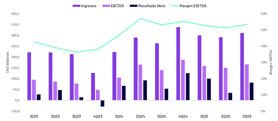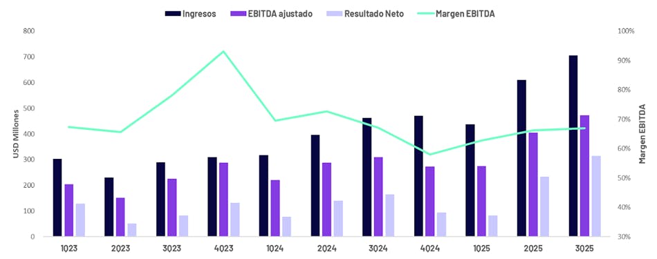 - Los ingresos totales fueron de USD 706 millones y registraron un aumento del 53% interanual y 16% secuencial, con un 60% de las ventas destinadas a exportación. Por su parte, el EBITDA ajustado alcanzó USD 472 millones reflejando una suba del 52% y/y y 17% q/q, y un margen de 67%.