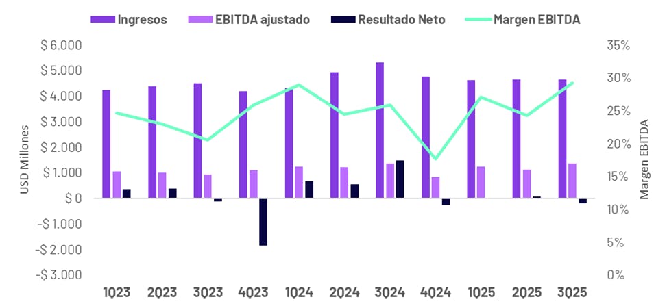 - El resultado neto cerró en USD -198 millones, revirtiendo la ganancia reportada en el trimestre previo. La variación se explicó principalmente por una pérdida financiera neta de USD -245 millones y una mayor carga por impuesto a las ganancias (USD -537 millones), asociada mayormente a efectos no monetarios provenientes de impuesto diferido.
