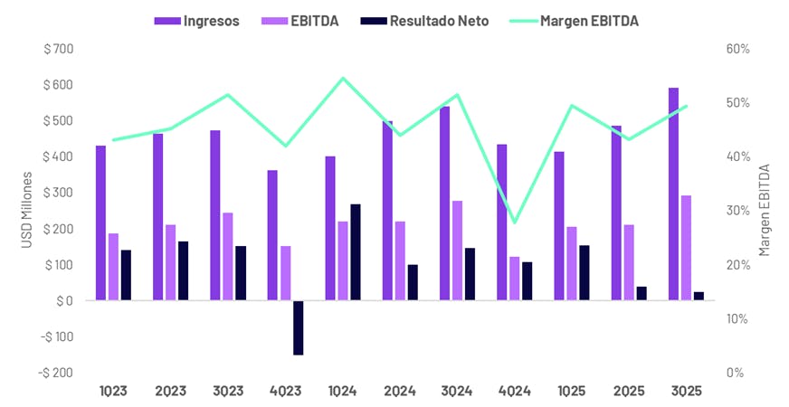 - El EBITDA ajustado ascendió a USD 322 millones (+16% interanual), reflejando mayor contribución de hidrocarburos, exportaciones de gas y mejores márgenes en generación eléctrica por autoabastecimiento de combustible. La ganancia neta fue de USD 23 millones, afectada por un mayor impuesto diferido sin impacto en caja.