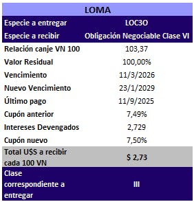 - Para el canje, la relación de canje va a ser de VN 103,37 por cada VN 100 de LOC3O entregados.