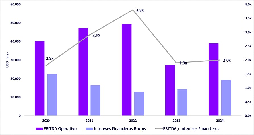 Es el ratio que se obtiene de establecer la relación del EBITDA con respecto a los intereses netos. Este indicador permite conocer la capacidad de un emisor de cumplir con los pagos de intereses de la deuda emitida, con flujos de caja provenientes de la actividad principal.