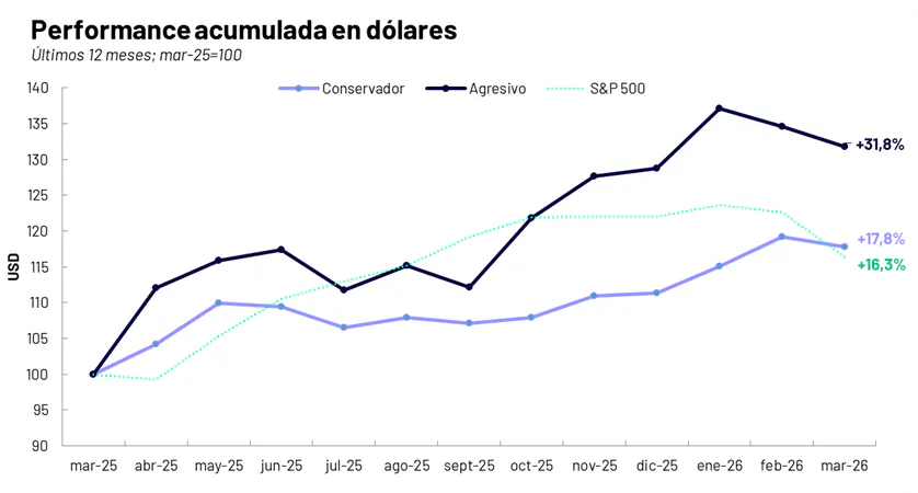 - En los últimos 12 meses, el portafolio de Inversiones Estables registró un rendimiento de +17,8%, mientras que el portafolio Agresivo alcanzó una ganancia de +31,8%, ambos en dólares, con este último superando ampliamente el desempeño del S&P 500 (+16,3%).