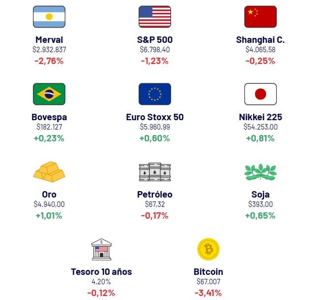 - Los bonos soberanos en dólares, tanto Bonares como Globales, registraron un descenso promedio del 0,2% durante la jornada. Este retroceso provocó que el riesgo país subiera 16 unidades hasta los 516 puntos básicos, alcanzando así su nivel más alto desde el pasado 23 de enero.