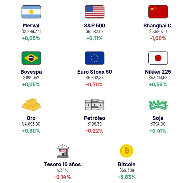 - Las acciones del sector cripto repuntan en Wall Street impulsado por la subida del Bitcoin (BTC) por encima de los USD 69.000. La criptomoneda líder registró un alza superior al 1% este lunes, traccionando positivamente a las empresas con exposición directa al activo: la plataforma Coinbase (COIN) avanzó por encima del 3% y la firma de tesorería institucional Strategy (MSTR) lideró las ganancias con un salto cercano al 4%. Este movimiento refleja la estrecha correlación entre el precio de la divisa digital y el rendimiento bursátil de las compañías del ecosistema.