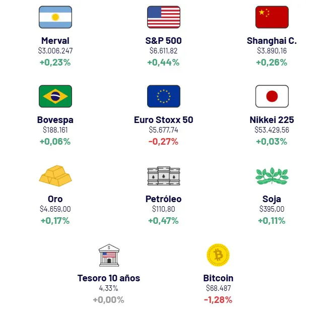 - Las acciones de empresas petroleras operaron mayoritariamente al alza, sostenidas por precios del crudo que se mantienen firmes por encima de los 110 dólares por barril. Este avance, que incluye subas del 0,4% en Exxon Mobil (XOM) y Chevron (CVX), se produce ante la amenaza del presidente Donald Trump de atacar la infraestructura civil de Irán a partir de las 8 p.m. de este martes.