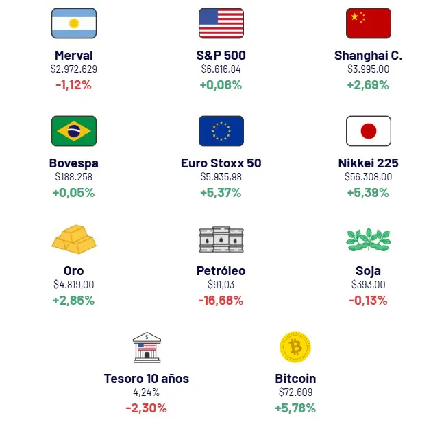 - La deuda soberana argentina rebota con fuerza y el riesgo país cae a los 550 puntos tras el alivio geopolítico global. Los bonos en dólares registran subas de hasta el 3,6% en el pre-mercado, impulsados por la tregua en Medio Oriente que favorece la vuelta de capitales a mercados emergentes. Debido a su alta sensibilidad ("beta") a las noticias internacionales, Argentina lidera la recuperación, logrando que su curva de rendimientos regrese al terreno del dígito único. Con este descenso del 10% en el riesgo país respecto a la semana pasada, el mercado local vuelve a posicionarse cerca de los rendimientos de países como Ecuador o Egipto, acercándose nuevamente al piso histórico de los 500 puntos básicos alcanzado antes del conflicto.