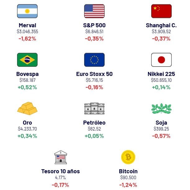 - El S&P Merval cayó un -1,62% en la última jornada hábil, cerrando en 3.046.354. Las mayores alzas de la sesión fueron TRAN (+3,67%),TGNO4 (+1,32%), BYMA (+0,58%). Por otra parte, las mayores bajas de la rueda fueron EDN (-4,30%), SUPV (-4,16%), TXAR (-3,02%).