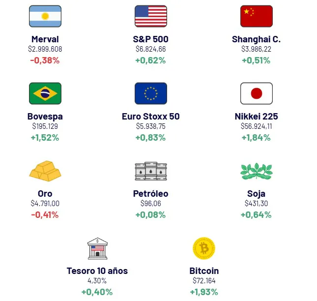 - Los bonos soberanos en dólares, tanto los Bonares como los Globales, registraron un sólido avance promedio del 1% durante la jornada. Este impulso positivo permitió que el riesgo país de Argentina descendiera 17 unidades, cerrando en los 557 puntos básicos.