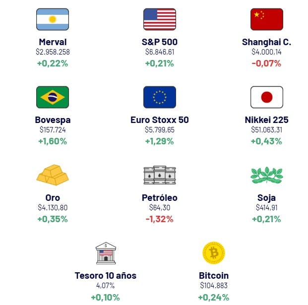 - Los bonos soberanos en dólares mostraron un nuevo avance de hasta el 1%, liderados por el Global 2030 (GD30), seguidos por el Bonar 2035 (AL35) (0,5%) y el Global 2038 (GD38) (0,3%). Esta tendencia alcista se consolida después del fuerte salto del lunes, cuando los títulos ganaron hasta un 2,9% e hicieron que el riesgo país cayera por debajo de los 600 puntos básicos por primera vez desde enero.
