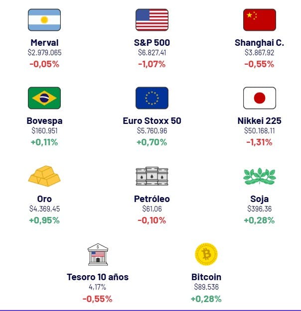 - Los bonos soberanos en dólares (tanto Bonares como Globales) experimentaron una subida promedio del 0,5% en la sesión del viernes. Por su parte, el riesgo país de JP Morgan para Argentina descendió ocho unidades, situándose en los 624 puntos básicos.
