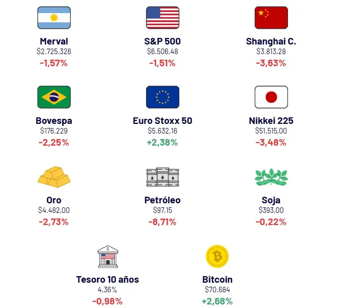 - El presidente Donald Trump anunció una tregua de cinco días en los ataques militares contra la infraestructura energética de Irán, tras calificar como "productivas" las recientes conversaciones para resolver las hostilidades en Medio Oriente. El anuncio provocó una respuesta inmediata en los mercados: el petróleo crudo llegó a desplomarse un 13% antes de recortar pérdidas, mientras que los futuros del S&P 500 saltaron hasta un 2,5%. A pesar del optimismo de la Casa Blanca, medios oficiales iraníes negaron la existencia de diálogos directos o indirectos, calificando las declaraciones de Trump como parte de una "guerra psicológica".