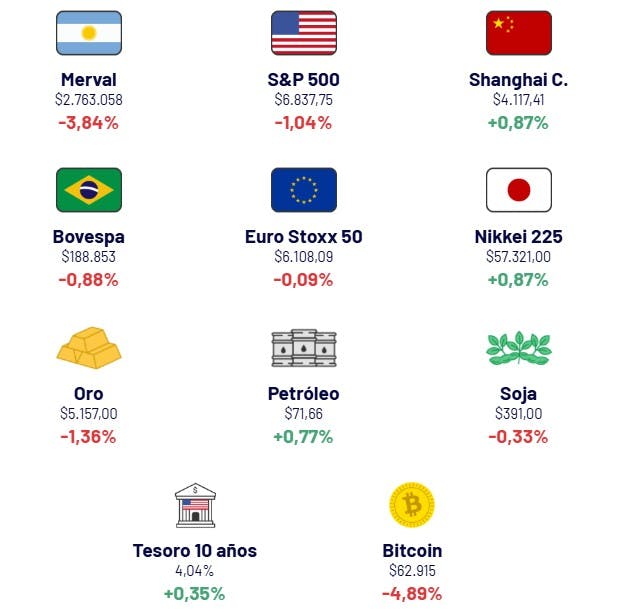 - Los bonos soberanos en dólares, incluyendo tanto los Bonares como los Globales, registraron una caída promedio del 1% durante la jornada. Como consecuencia de este retroceso, el riesgo país elaborado por JP Morgan aumentó 20 unidades para situarse en los 537 puntos básicos.