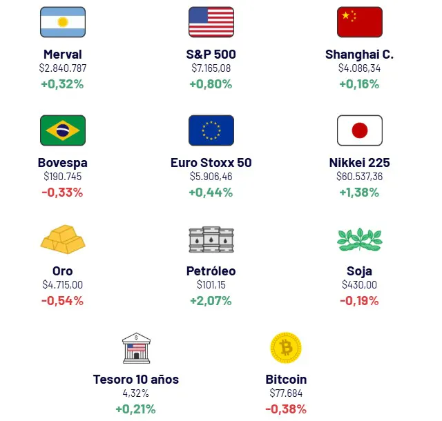 - Los futuros de los índices en EE. UU. operan con una tendencia levemente bajista este lunes, mientras los inversores se preparan para una semana de operaciones sumamente activa. El mercado mantiene la cautela ante una agenda cargada que incluye desde tensiones geopolíticas hasta los resultados financieros de las grandes compañías tecnológicas vinculadas a la inteligencia artificial. De esta manera, los futuros del Dow Jones caen un 0,14%, los del S&P 500 un 0,10%, mientras que el Nasdaq 100 pierde un 0,07%.