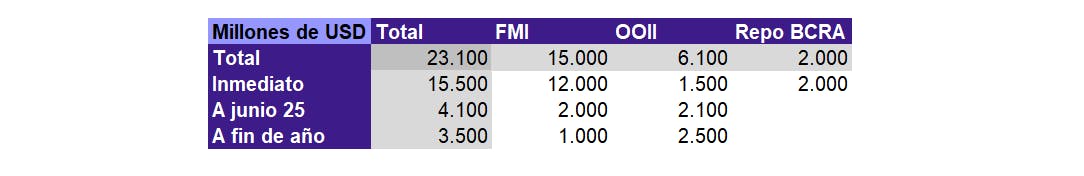 - El Gobierno logró cerrar un acuerdo financiero que le permitió asegurarse un desembolso inicial considerablemente superior al esperado. En total, se preveía un flujo inmediato de US$ 17.600 millones, de los cuales ya se efectivizaron US$ 13.500 millones, US$ 12.000 millones provenientes del FMI y US$ 1.500 millones del BID. Aún resta concretar un REPO adicional de US$ 2.000 millones. Este primer desembolso representa el 60% del monto total comprometido en el programa con el FMI, una cifra excepcionalmente alta si se la compara con otros acuerdos recientes, lo que refuerza la disponibilidad de liquidez en el corto plazo y permite sostener el esquema de bandas cambiarias recientemente implementado.