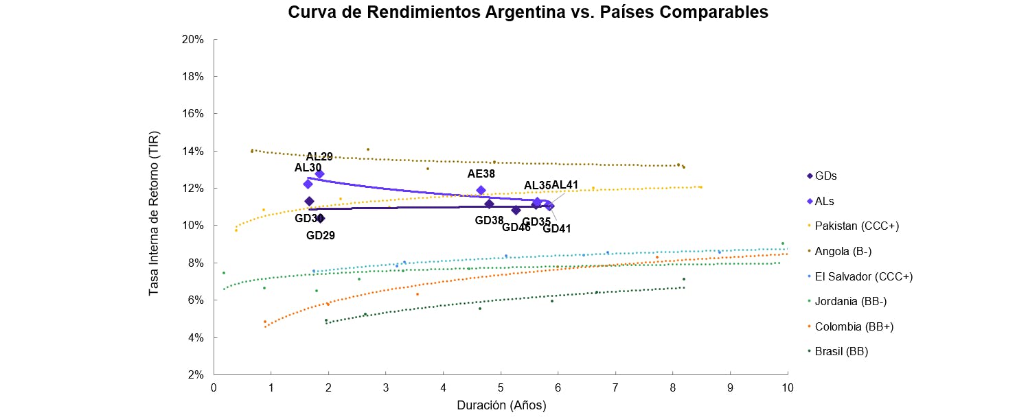 - A juzgar por el panorama local de la actualidad esperamos que, ante una normalización en el mediano plazo de la macroeconomía (con estabilización de la inflación, déficit fiscal cero y la actividad ya en crecimiento) sumado a las recientes definiciones más concretas en el plano cambiario, la curva pueda acercarse al 9% que rinden El Salvador y Jordania, en sus vencimientos más largos.