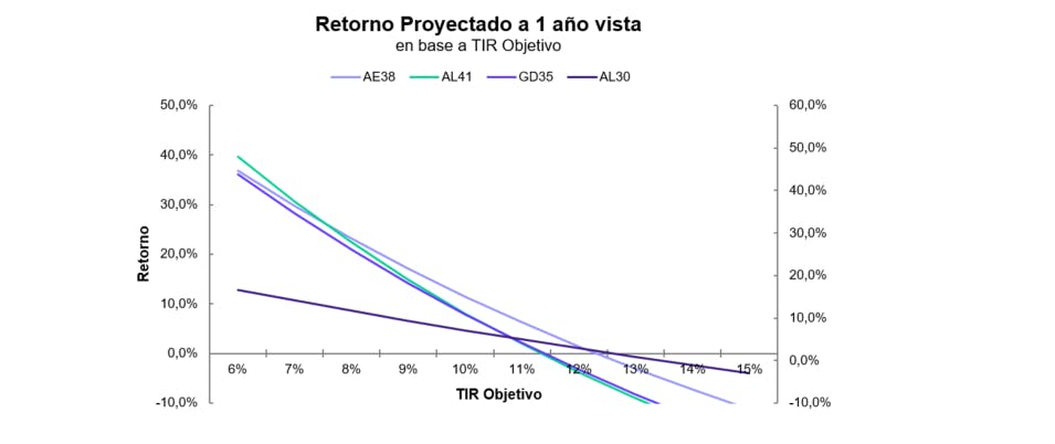 - Bajo un escenario de aplanamiento de la curva hacia esos niveles de rendimiento, que consideramos el más probable en un contexto de normalización del riesgo país, el AL30 ofrecería un retorno total cercano al 9% (TIR objetivo 9,0%), mientras que los retornos del AE38, GD35 y AL41 superarían el 10% directo (TIR objetivo 10,0%). Este sería el primer objetivo de valorización para la deuda soberana. Si el entorno macroeconómico y las condiciones externas continúan mejorando y las tasas de referencia bajan aún más, los bonos de mayor duration capturarían una ganancia adicional frente a los de menor plazo. En este sentido, aunque el AL30 presenta mejores retornos en escenarios donde la TIR se mantiene superior al 11% (apoyado en el efecto del pago de capital versus solo intereses de los bonos largos), para que su retorno se vuelva negativo, la tasa de rendimiento debería escalar por encima del 13%.