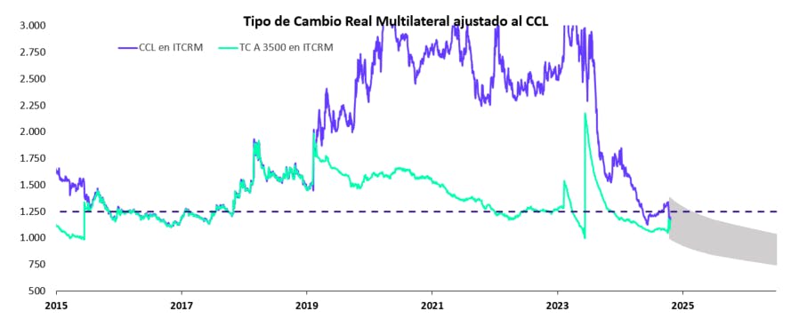 - El nuevo esquema contempla la liberalización del tipo de cambio mediante la implementación de un régimen de bandas cambiarias. Este sistema establece un rango inicial de $1.000 a $1.400 por dólar, que evolucionará gradualmente con un crawling-peg del ±1% mensual. El BCRA tendrá la obligación de intervenir solo en los extremos de la banda para acumular reservas o absorber liquidez, sin esterilizar estas operaciones, y podrá realizar operaciones de mercado abierto dentro del rango. El reciente acuerdo con el FMI refuerza la credibilidad de este esquema, aumentando la previsibilidad de la política económica.
