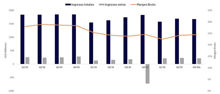 - Las acciones de GlobalFoundries acumulan una caída del -17% YTD, situación que refleja la preocupación del mercado por la debilidad persistente en el segmento de Smart Mobile Devices, el cual representa cerca del 40% de los ingresos. Un prolongado período de sobreoferta, junto con la corrección de inventarios en clientes clave y una creciente presión sobre los precios en los contratos, impactaron negativamente en la dinámica de los resultados.