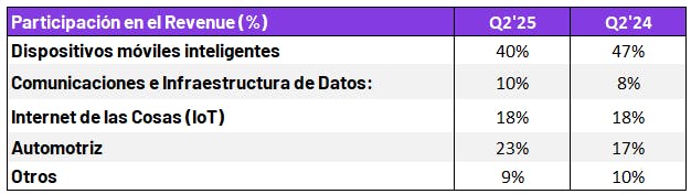 - En particular, automotriz e infraestructura de comunicaciones y centros de datos registraron crecimientos del +36% y +11% respectivamente. Sin embargo, debido al elevado peso del segmento móvil en el total de ventas, el crecimiento consolidado de la compañía se limitó a un +3% interanual, dejando en evidencia un trimestre más de estancamiento en el crecimiento de la compañía.