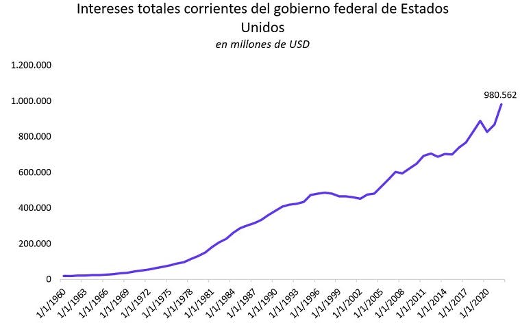 - Respecto a los puntos planteado sobre la sostenibilidad de la deuda de EEUU, si el nivel de tasa de interés es elevado y se sostiene en rangos altos durante más tiempo significan que el Gobierno Federal tiene que pagar un costo mayor por su propia deuda. Según datos actuales, el interés que hoy acompaña a la deuda norteamericana estaría cercano al billón de dólares, lo cual demuestra que el propio gobierno norteamericano tendrá que realizar mayor esfuerzo para cumplir con dichos pagos correspondientes de su deuda.
