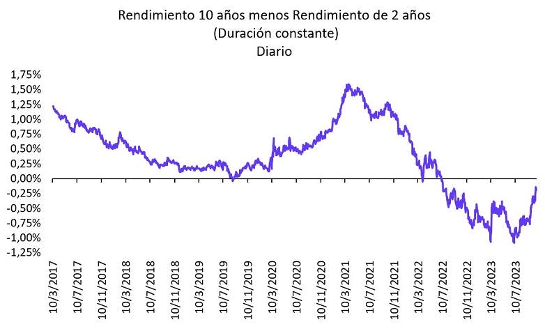 - Sin embargo, el spread (diferencia entre el bono a 10 años y el bono a 2 años) comprimió desde comienzo de octubre, lo cual, esta combinación de factores sugiere que de no darse una recesión (Goldman Sachs recortó recientemente la probabilidad de recesión al 15% para 12 meses) o continuar el sendero de baja de inflación, el spread entre plazos debería disminuir con una baja en las tasas de menor plazo.