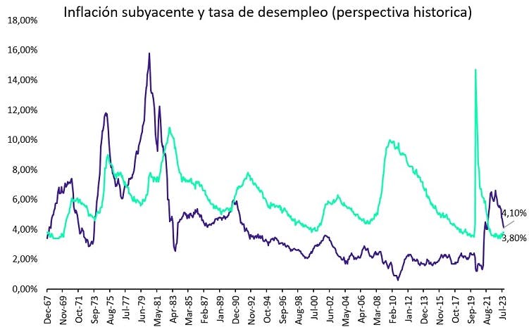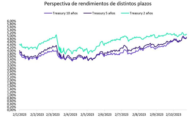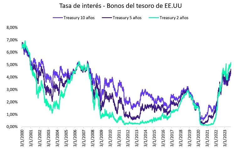 La primera parte del año 2023 se caracterizó por un proceso de baja en los rendimientos de los bonos del Tesoro norteamericano, principalmente en la parte larga. Sin embargo, desde mediados de julio de 2023, la dinámica del mercado de renta fija norteamericana viró volviendo a plantear el debate sobre cómo posicionarse en lo que respecta a estos activos. Esto se observó en la suba en las tasas de los bonos norteamericanos principalmente más largos.
