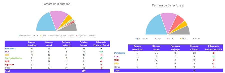 - Por otro lado, en lo que refiere a la Cámara de Senadores, LLA pasó de contar con 6 bancas a multiplicar por 3 su participación, al totalizar 18. Fuerza Patria perdió 6 lugares, mientras que el PRO y la UCR también tuvieron una baja performance al ceder 2 y 3 bancas respectivamente.