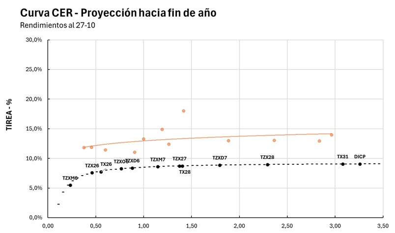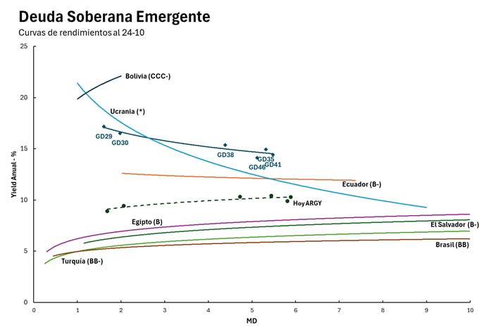 - Más allá del resultado electoral, es fundamental mantener la mirada en las curvas de los comparables emergentes. En este sentido, la mayoría de los países emergentes exhiben rendimientos por debajo de los dos dígitos, lo que refuerza la idea de que una normalización de precios en Argentina requeriría una compresión significativa del riesgo país. En los últimos meses donde primó la volatilidad e incertidumbre, la curva soberana local quedó lejos de situaciones como Ecuador, Angola o Pakistán, que pese a sus desafíos estructurales exhibieron una dinámica más constructiva en sus curvas, reflejando el actual viento en popa para la deuda emergente. Las curvas de Egipto, El Salvador y, en menor medida, Turquía se perfilan como las referencias del segmento de deuda soberana de alto rendimiento, marcando el norte para la compresión potencial de spreads locales.