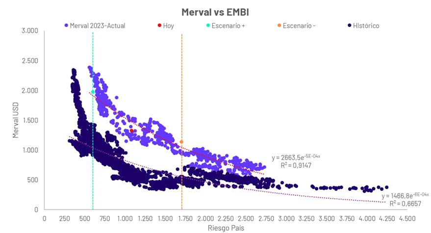 - Ahora bien, entendemos que, más allá de la linealidad que puede mostrar el gráfico, existen otros factores que están actuando de freno. En este sentido, entendemos que la dinámica recientemente experimentada por los bonos argentinos y por consiguiente el riesgo país, abre el interrogante acerca de si la relación entre riesgo país y Merval experimentada de 2023 hasta la fecha es una excepción, y lo que se debe mirar en realidad es la relación histórica de las variables en cuestión.