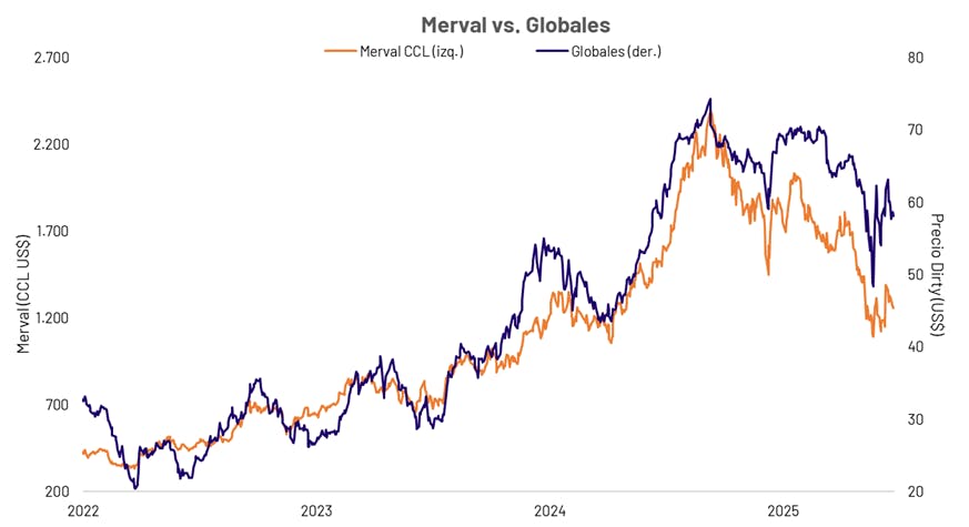 - Sin embargo, desde principio de 2025 se ve con claridad cómo los soberanos han estado overperforming a la renta variable, profundizándose la ampliación de la brecha principalmente desde mayo cuando sucedió el último rebote del Merval. El interrogante que se genera en este punto es si, despejada la variable eleccionaria el equity podrá ir a cerrar el gap.