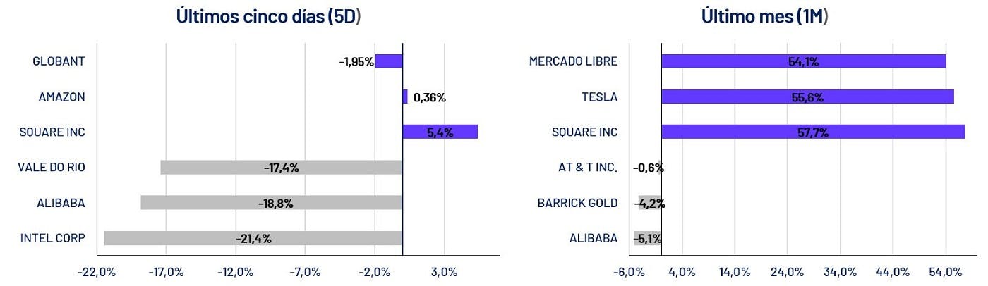 • Variaciones: Las variaciones refieren al cambio del precio del activo en un periodo determinado. En el reporte los horizontes tomados corresponden a: Una semana (5D), Un mes (1M) y la variación desde el comienzo del año (YTD). Los gráficos corresponden a la performance de los mejores y peores tres activos para cada horizonte de tiempo.