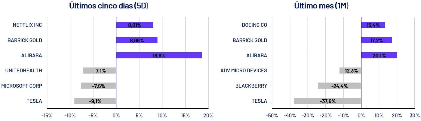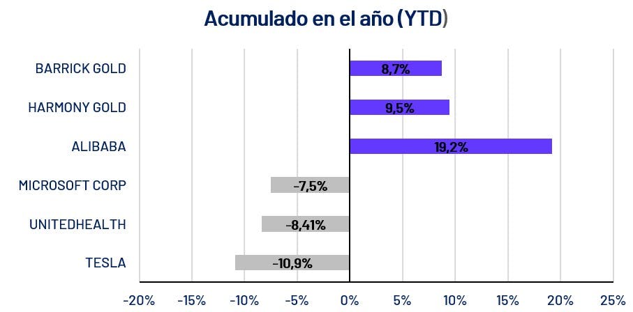 • Variaciones: Las variaciones refieren al cambio del precio del activo en un periodo determinado. En el reporte los horizontes tomados corresponden a: Una semana (5D), Un mes (1M) y la variación desde el comienzo del año (YTD). Los gráficos corresponden a la performance de los mejores y peores tres activos para cada horizonte de tiempo.