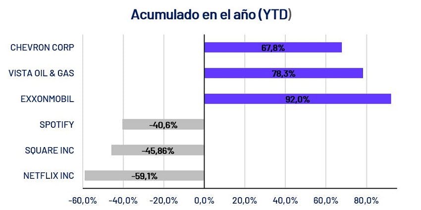 • Variaciones: Las variaciones refieren al cambio del precio del activo en un periodo determinado. En el reporte los horizontes tomados corresponden a: Una semana (5D), Un mes (1M) y la variación desde el comienzo del año (YTD). Los gráficos corresponden a la performance de los mejores y peores tres activos para cada horizonte de tiempo.