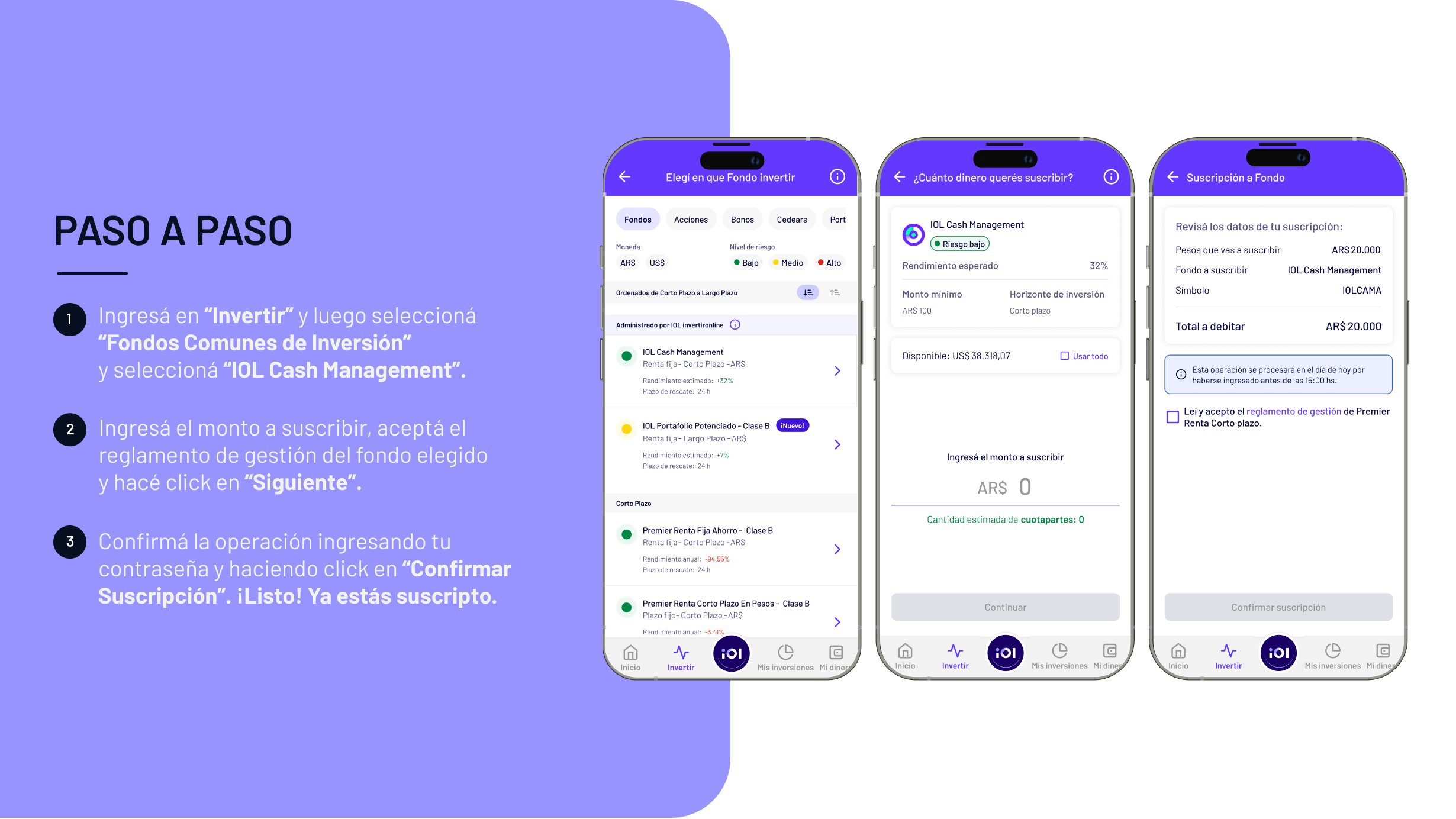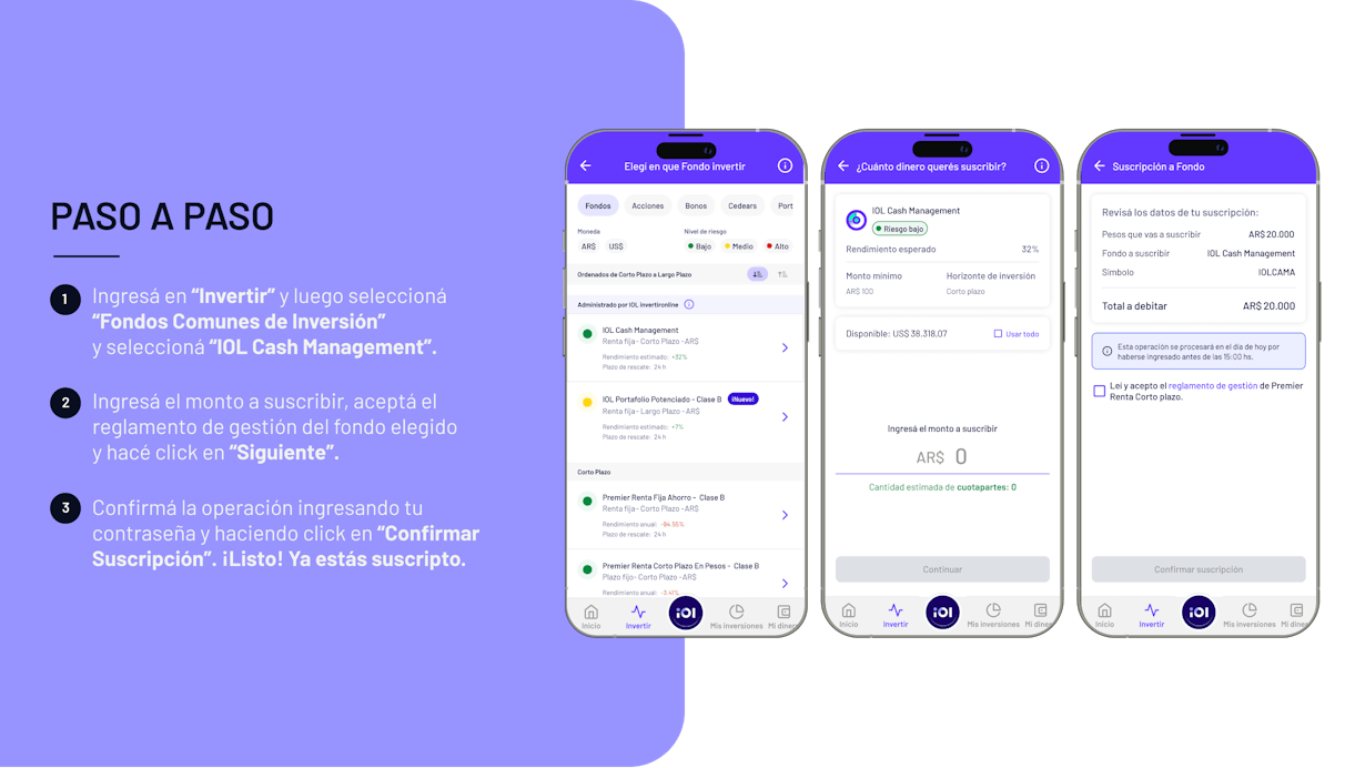 A continuación te contamos el paso a paso para operar el Fondo Común de Inversión en Pesos IOL Cash Management.