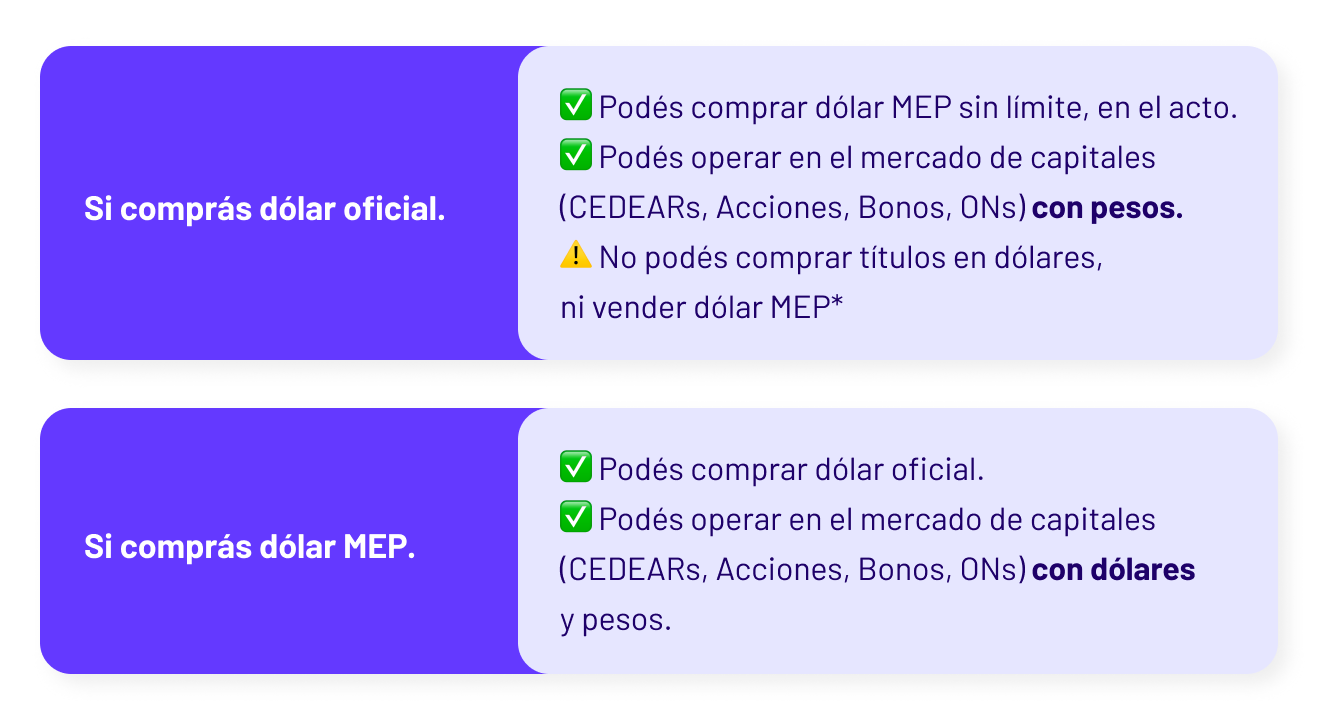 En caso de haber comprado dólar oficial, también podés comprar dólar MEP sin restricción y de manera inmediata, pero no vas a poder venderlo.