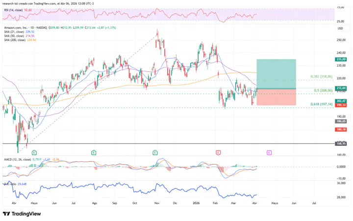 - Adicionalmente, lo técnico se encuentra alineado con lo fundamenta, donde AMZN muestra un múltiplo de P/E por debajo de la media de la compañía y coincidente con los valores mínimos registrados en el "Liberation Day" de abril de 2025.
