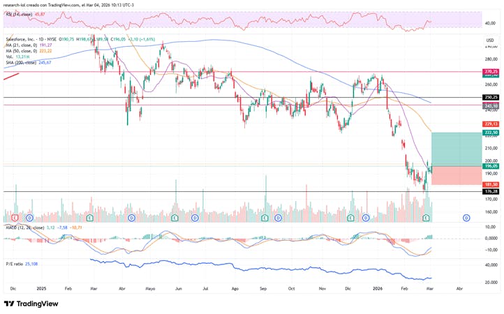 - Abrimos señal de compra en Salesforce. Luego de la reciente caída donde la acción corrigió más de 30%, identificamos una cierta zona de soporte en torno a los USD 176.