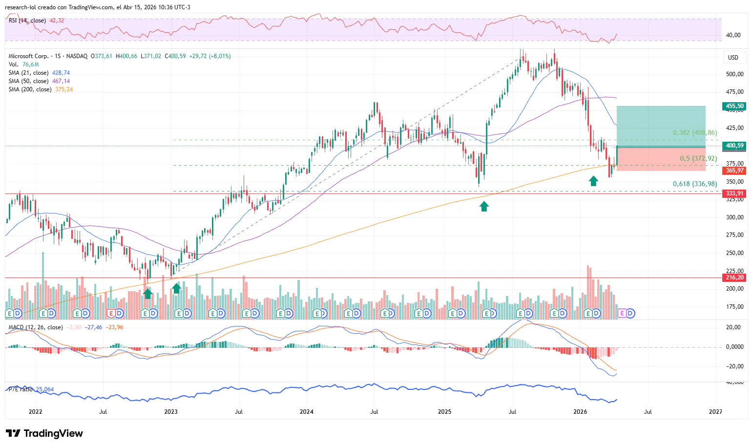 - Por último (y no menor) consideramos que lo técnico se encuentra alineado con lo fundamental, donde MSFT presenta un múltiplo de P/E de 24,6x que es coincidente con el mínimo de valuación alcanzado en las últimas correcciones significativas del papel (2019, 2020, 2022 y la actual).
