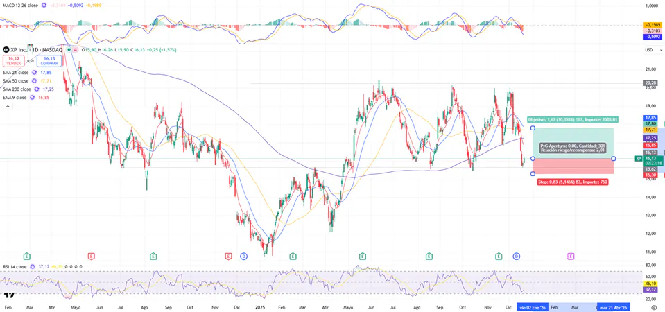 - Abrimos señal de compra en XP. Luego de la reciente corrección del equity brasileño, vemos una oportunidad para reposicionarnos en el mercado, con XP mostrando una estructura técnica atractiva.