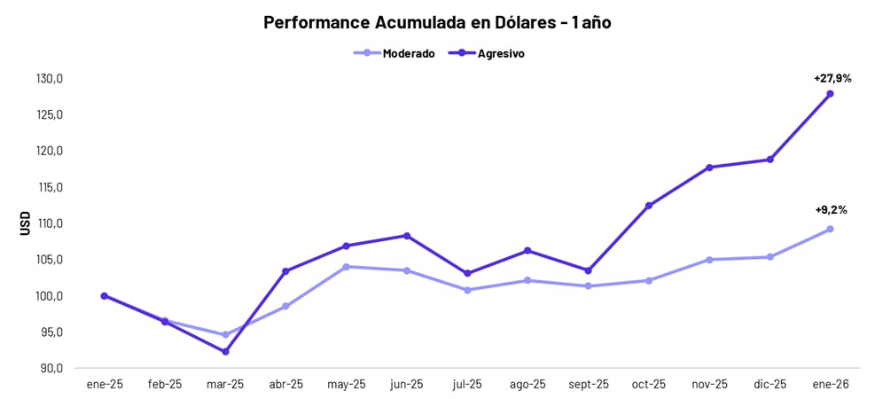 - En los últimos 12 meses, el portafolio de Inversiones Estables registró un rendimiento de +9,2%, mientras que el portafolio Agresivo alcanzó una ganancia de +27,9%, ambos en dólares, con este último superando ampliamente el desempeño del S&P 500 (+14,8%) en lo que fue nuevamente un buen año para el índice norteamericano.
